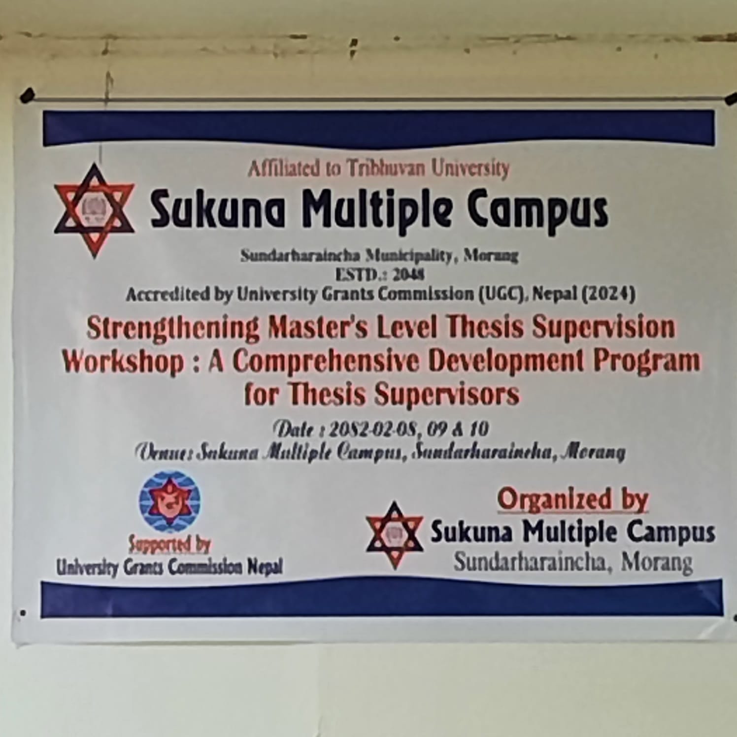 Sukuna Multiple Campus, an institution accredited by the University Grants Commission (UGC) Nepal and affiliated with Tribhuvan University, is hosting a three-day intensive workshop titled "Strengthening Master's Level Thesis Supervision: A Comprehensive Development Program for Thesis Supervisors." Scheduled for Jestha 08, 09, and 10, 2082, at the campus premises in Sundarharaincha, Morang, this program is organized with the strategic support of the University Grants Commission Nepal. The workshop aims to elevate academic standards by providing thesis supervisors with advanced tools and methodologies to better guide postgraduate students through the research process. By focusing on professional development and standardized supervision practices, Sukuna Multiple Campus continues to strengthen its research culture and institutional excellence following its recent 2024 accreditation.