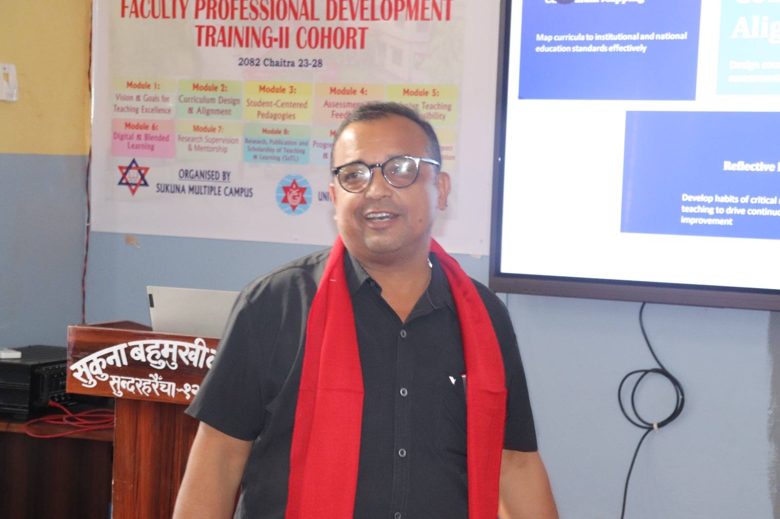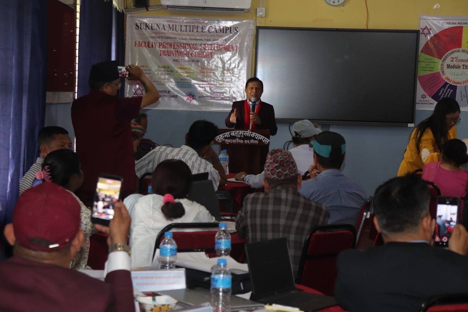 Highlights from the Faculty Professional Development Training-2nd Cohort The inaugural session was honored by the presence of Prof. Dr. Devraj Adhikari, Chairman of the University Grants Commission (UGC), who served as the Chief Guest. Organized by Sukuna Multiple Campus with the support of UGC Nepal, this intensive 48-hour training for the faculties of community campus started on Chaitra 23 and end on 28. A total of 30 faculty members representing 17 community campuses participated in the training.